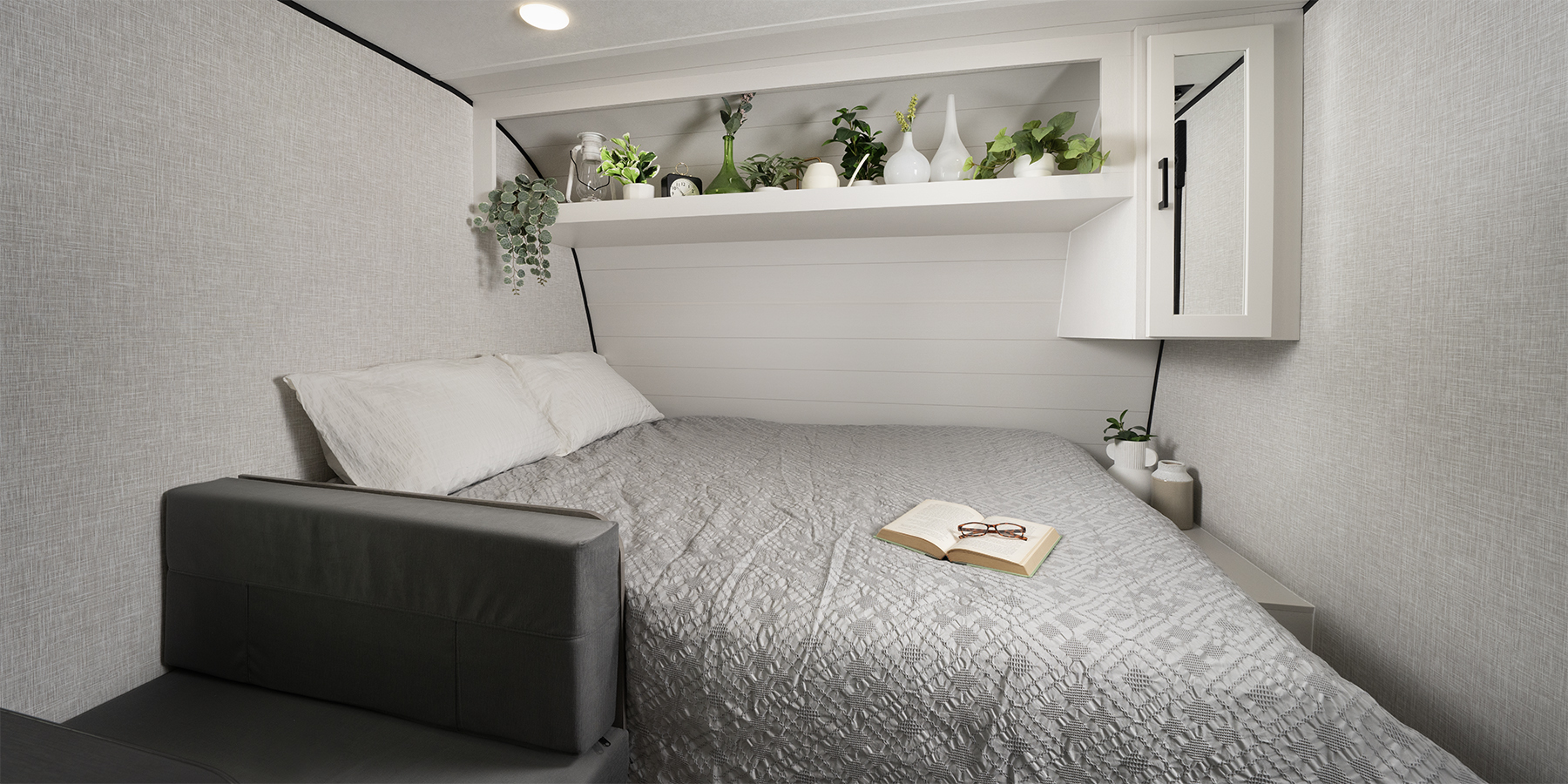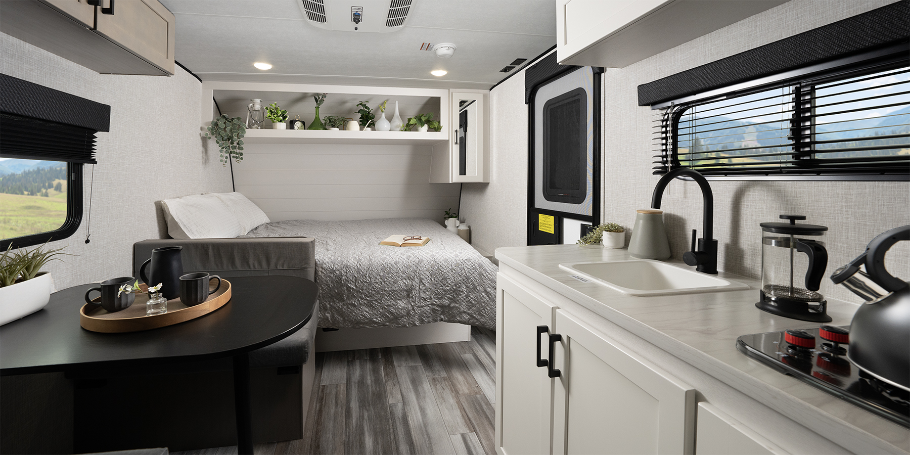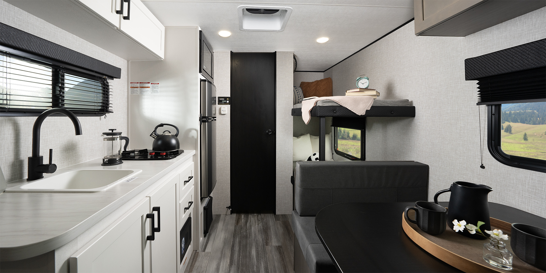From the vinyl flooring throughout to the residential-style hidden cabinet door hinges, every detail has been designed to enhance your comfort. Enjoy your favorite meals at the sturdy plywood dinette, and rest easy on a queen mattress or in our ultra-durable bunk beds, rated to handle 300-600 lbs.