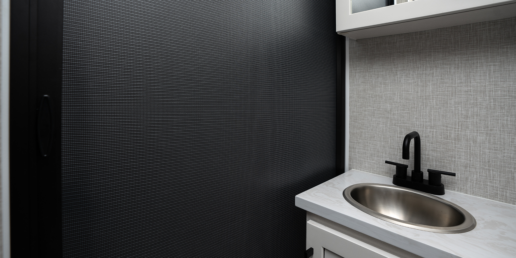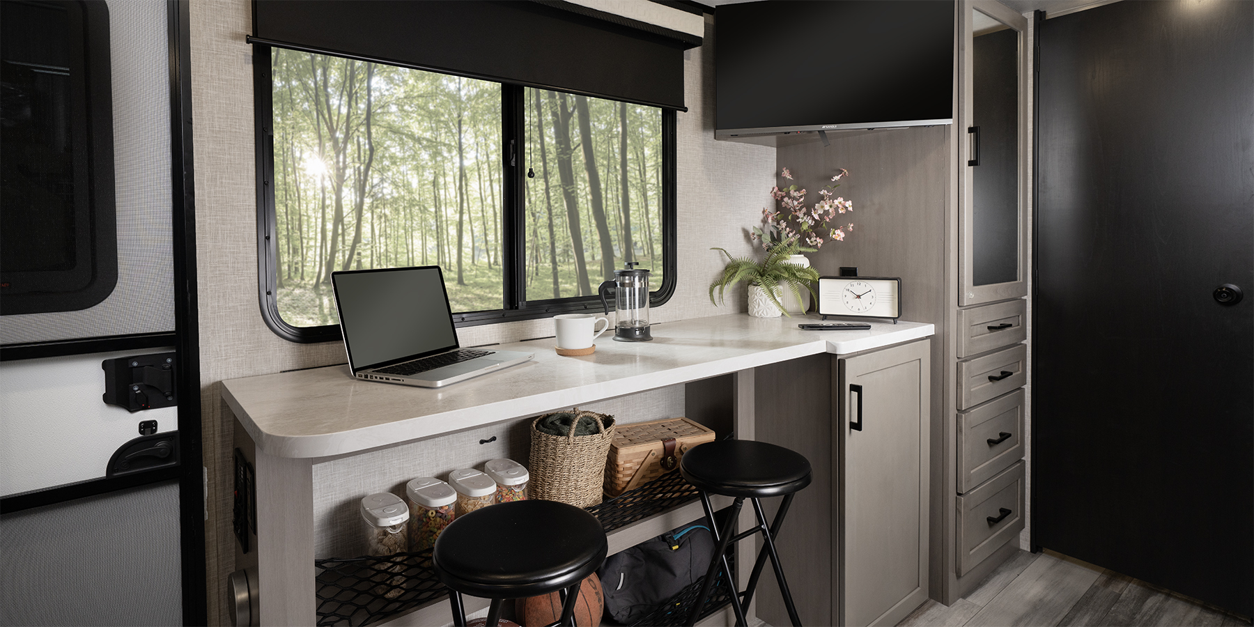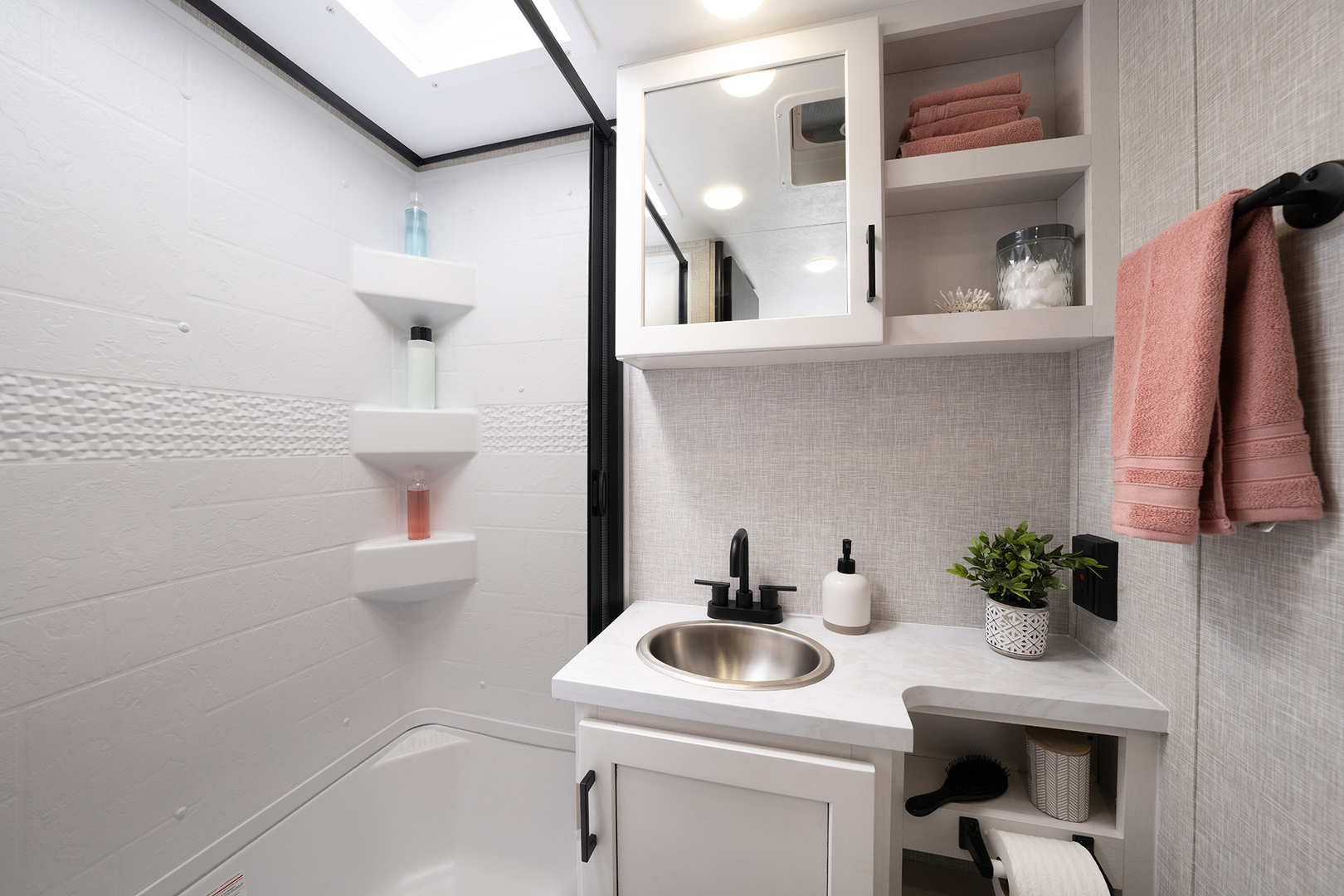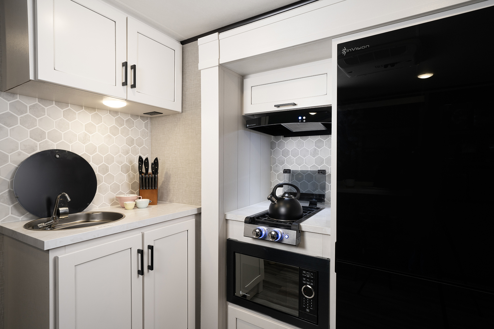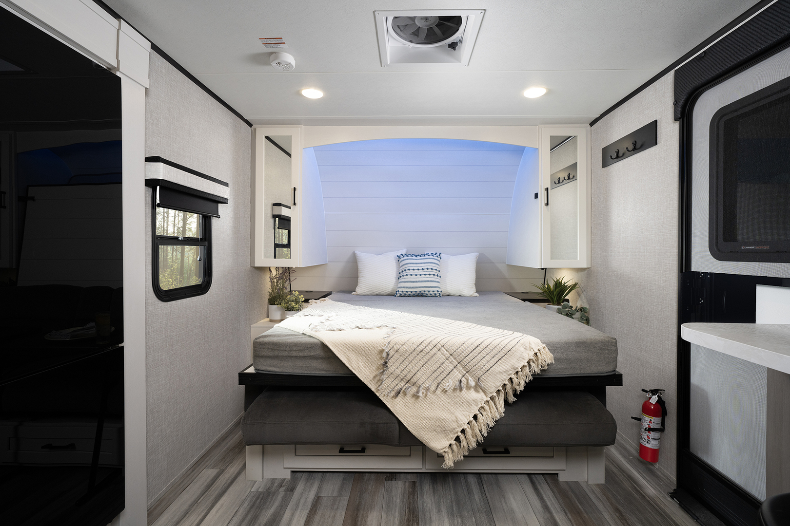 The cabinet doors and drawers are oversized, increasing storage space and maximizing the overall use of space. Hidden hinges and a seamless countertop in the kitchen add to the luxurious, residential feel. The InVision Suite appliance package comes standard and includes an 11-cubic-foot 12V fridge, which is five cubic feet larger than other brands. The kitchen in this lightweight travel trailer also features a stainless-steel sink with a fold-down faucet and glass top. In the bathroom, you’ll find high-rise gooseneck faucets and a new roller-style shower enclosure, that opens up the space even more.