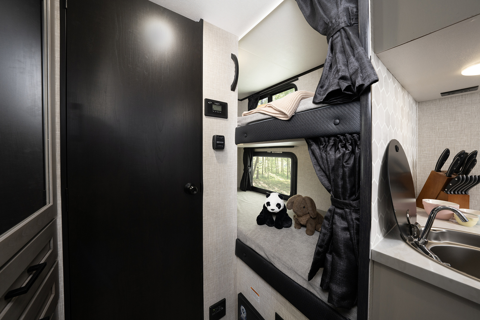 Additionally, this travel trailer comes standard with a 14-inch four-speed MaxxAir power roof vent in the main living area and standard 14-inch power roof vents in the bathroom for additional airflow and ventilation. These systems work together to ensure that you remain cool and comfortable, even on the hottest days. The Jayco Feather Air has some amazing features that set it apart from its competitors. First, the 60,000 BTU tankless water heater and 55-gallon freshwater tank provide an endless supply of hot water. The Jayco Feather Air also has a Rock-Solid Stabilizer System. This system is easy to use, and it creates a solid camping experience. Another factor in durability and comfort, is the plywood bed, bunk, dinette, and shower bases, which are all reinforced. The single-over-single bunks can hold 300 lbs. each, and the double-over-double bunks can hold 600 lbs. each.