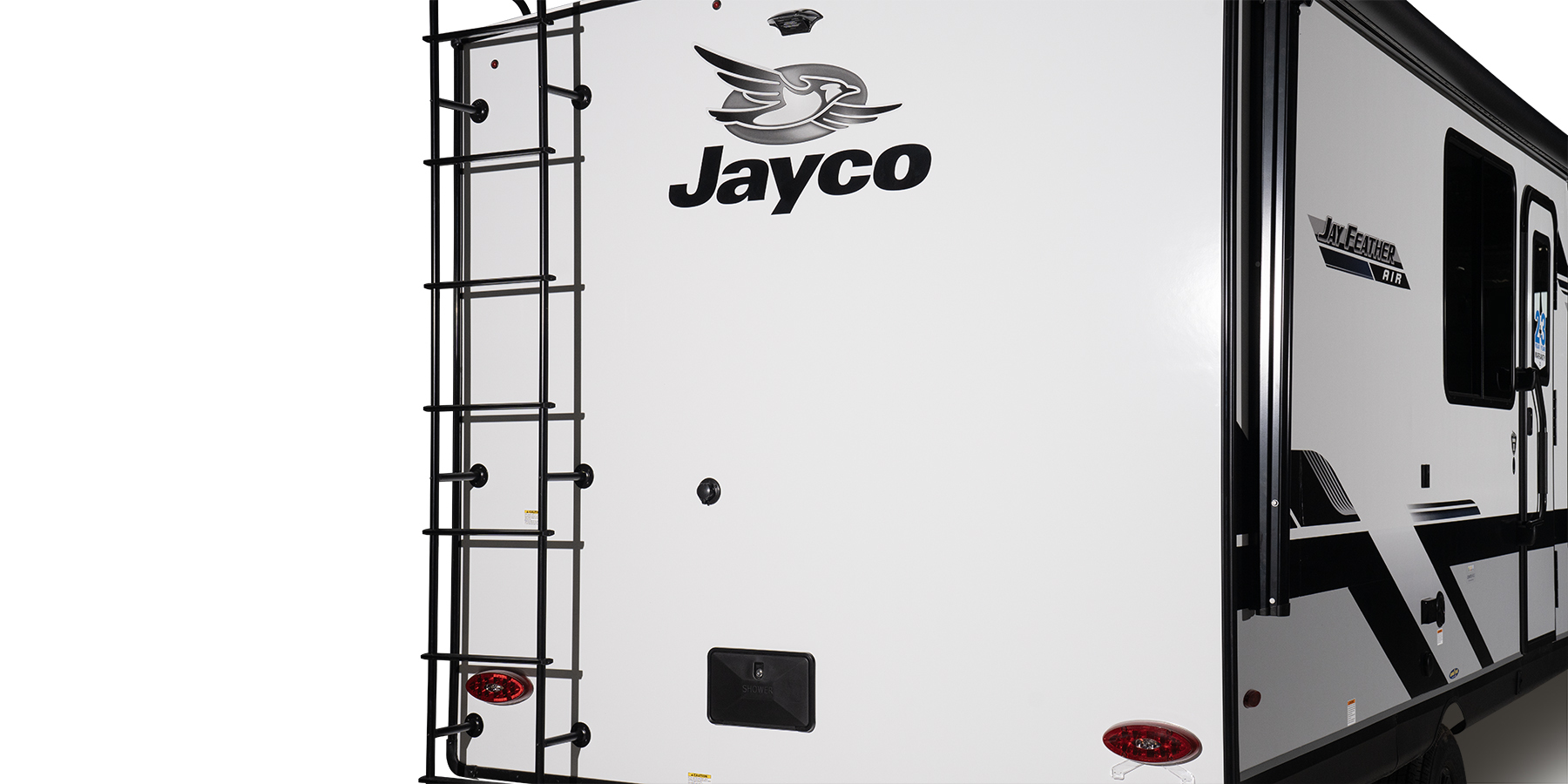 The exterior of the Jay Feather Air has its own list of standard features that make this entry-level travel trailer a must-have. We've stocked it with an 18-inch wide rear-mounted ladder for easy roof access, a two-inch rear receiver for towing, an under-mount sewer hose carrier, a spare tire in case of emergencies and more.