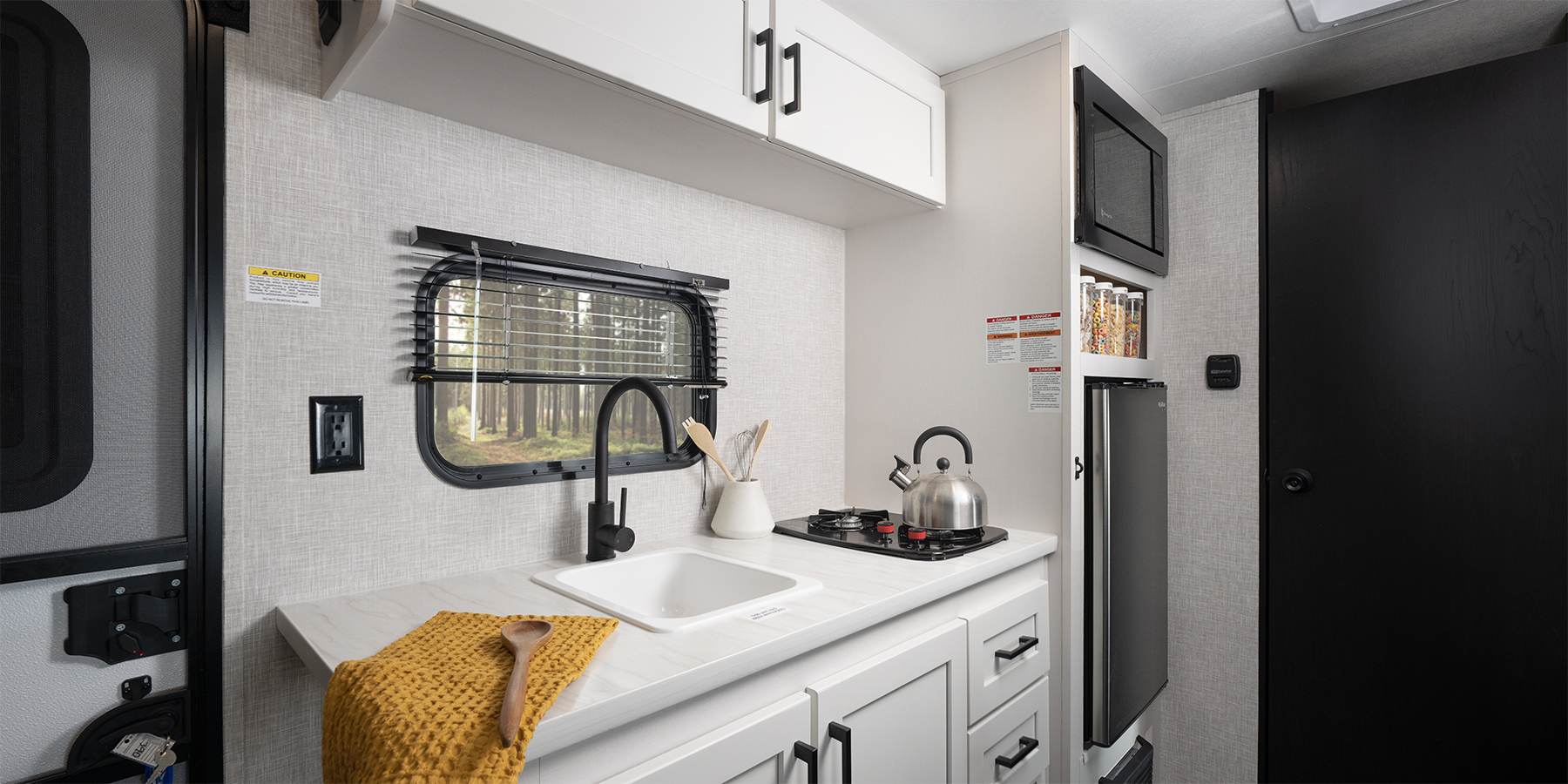 Inside, the Jay Flight SLX boasts some luxe residential features. Solid hardwood cabinet doors and drawers, with hidden cabinet hinges, offer a modern and sleek look. We continue to keep our owner's needs at the top of our mind, by offering oversized cabinets for increased storage space. In addition, you'll find maximized storage underneath the bed or bunk beds, under the dinettes, under the jack-knife sofas and even a neatly finished and lit exterior passthrough storage space. And just like our larger units, the Jay Flight SLX comes standard with a 60,000 BTU on-demand tankless water heater, for comfortable water temperatures as needed.