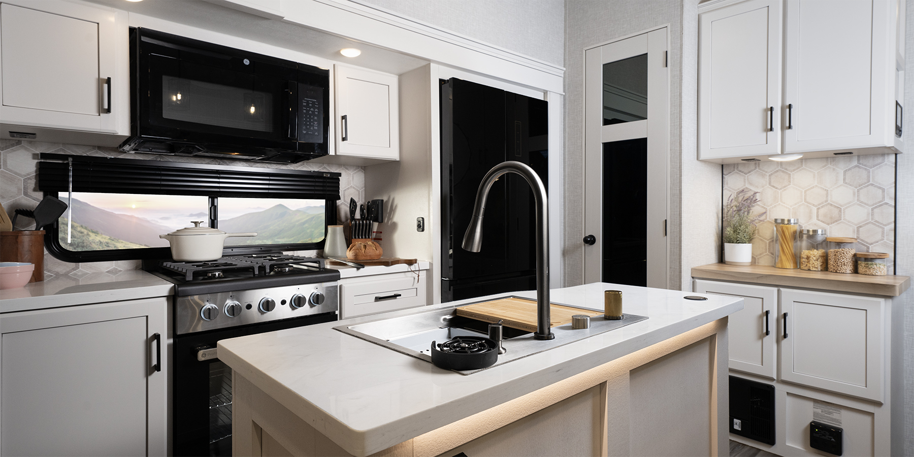 In the kitchen, you’ll find reliable GE brand appliances, including an edge-to-edge grate on the stove and an easy clean oven. The all-in-one sink can be used as a single basin or split up into multiple trays for multiple functions. If you feel like taking your cooking outdoors, the easy-to-start optional Halo Griddle offers a windproof design, wall-to-wall cooking, a dual-zone burner, a 300-500 degree range and an extra-large grease tray. If the weather turns, you can easily take the food indoors, where the dinette and office area can be quickly adjusted with the foldable chairs and pivoting table with an outlet below. Then, set the ambiance for dinner with the “Blue Sync” and MB Quart speakers for high-quality sound.