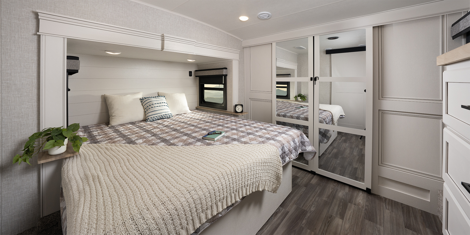 The top of the line in our Eagle offerings, the Eagle Fifth Wheel, boasts all the amenities you want and need in a fifth wheel. Designed with comfort in mind, it features the whole house NuvoH20 water system and an efficient duct system that eliminates the need for floor registers. The NuvoH20 water system works dry camping or on city water, with its salt-free citrus filter softener that filters 5,000 gallons and prevents and removes scale build up. This results in safer, healthier and tastier drinking water, softer water to wash with, and no hard water stains.