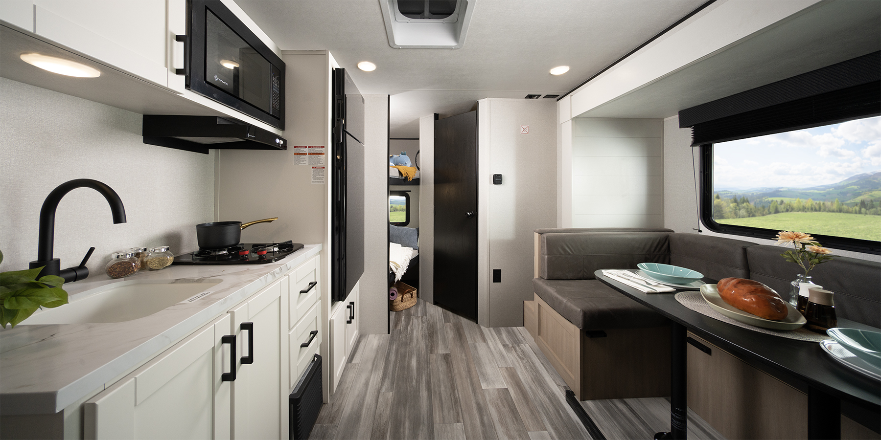 After a long day of exploring, step inside to enjoy instant hot water from the on-demand tankless water heater—up to 60,000 BTU in standard models and 42,000 BTU in the Sport Edition—so you can clean up comfortably, just like at home. Oversized G20 dark-tinted windows flood the space with natural light while blocking heat and UV rays, giving you both stunning views and added privacy.