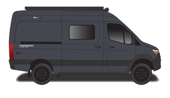 The Terrain rides on the Mercedes-Benz® Sprinter 2500 AWD chassis, equipped with a 144" wheelbase and a turbocharged 2.0L inline 4-cylinder Twin Turbo diesel engine that delivers 211 horsepower. Its powerful all-wheel drive system is backed by a suite of safety features to keep you in control wherever the trail leads. The JRide® ride and handling package adds Koni shocks and a heavy-duty rear stabilizer bar for a smooth and stable ride on rough terrain. When it’s time to gear up, a moveable roof ladder makes accessing your double roof rack simple, whether you're grabbing your kayak or storing camping essentials The integrated Lithionics® 48V 165 amp-hour smart lithium battery system supplies 7.9KW hours of clean, quiet power so you can stay off-grid longer. For those who prefer the affordability of a generator, a 2,500W LP generator can be optioned in place of the lithium package.
