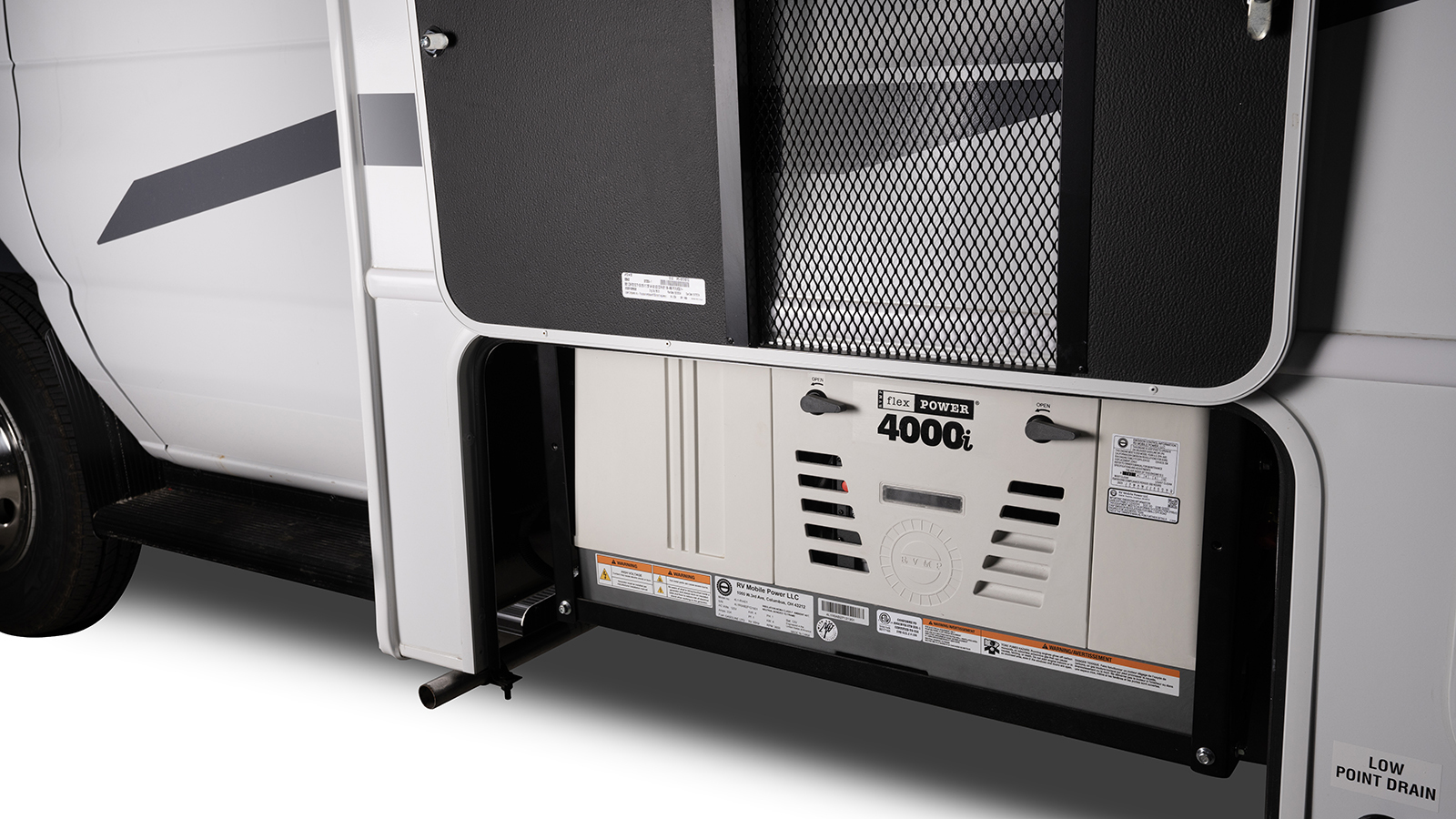 Traveling through cooler weather is easier, too. Heated holding tank pads help prevent freezing in low temperatures so you can pass through chilly climates without worry. An optional 200W solar panel with a dual controller and a second house battery helps keep your power topped off, even in storage. This setup extends the life of your batteries and ensures your coach is ready to go when you are. For even more convenience, the electric-powered entrance step opens automatically when you open the door, and a simple power switch lets you keep the step extended while parked. The integrated battery compartment keeps everything clean and compact.