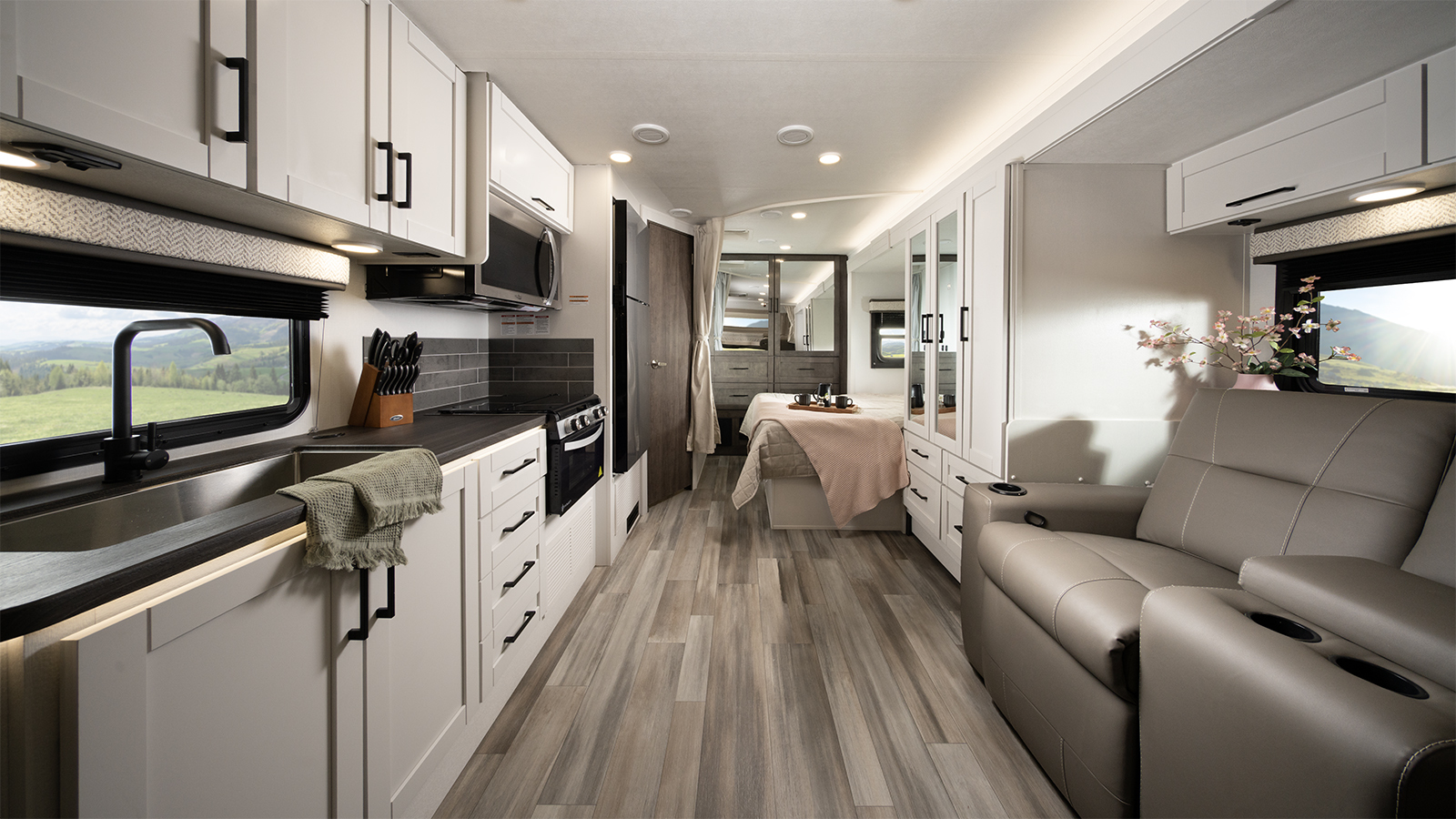 When you step up your Class C ownership with Jayco’s Redhawk, you're stepping into a new level of RV excellence. The differences between the Redhawk and Redhawk SE are clear from the start, beginning with the Redhawk’s sleek, frameless windows that give it a clean, automotive look while protecting seals from harmful sun exposure. That means a longer lifespan and fewer trips to the shop. Safety is also a priority, with side-view cameras offering full visibility down both sides of the coach while turning or changing lanes. The JRide® handling package adds to the smooth experience, with features like a computer-balanced driveshaft, front and rear stabilizer bars, Hellwig® helper springs, and rubber isolation body mounts. It all comes together for a ride that’s quiet, comfortable, and easy to enjoy—whether you're on a short getaway or a long haul. The one-piece seamless front cap is the only one of its kind on the market. This cap is designed to drastically reduce the risk of leaks in the most common location on a Class C motorhome. With Jayco’s extra attention to durability and detail, you’ll spend more time on the road and less time in the service bay. An automotive-bonded panoramic window in the cap adds to its appeal and provides stunning views from the overhead bunk. Staying cool is easy, too, with a standard 15,000 BTU ducted A/C or the option to upgrade to dual 13,500 BTU units with a power management system, so comfort is always part of the journey.