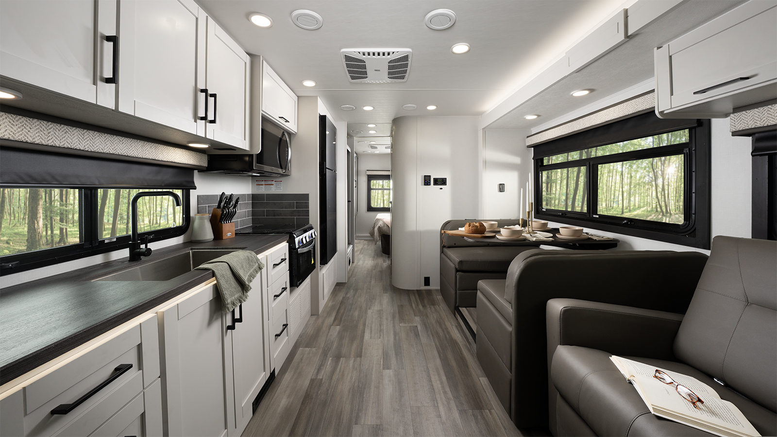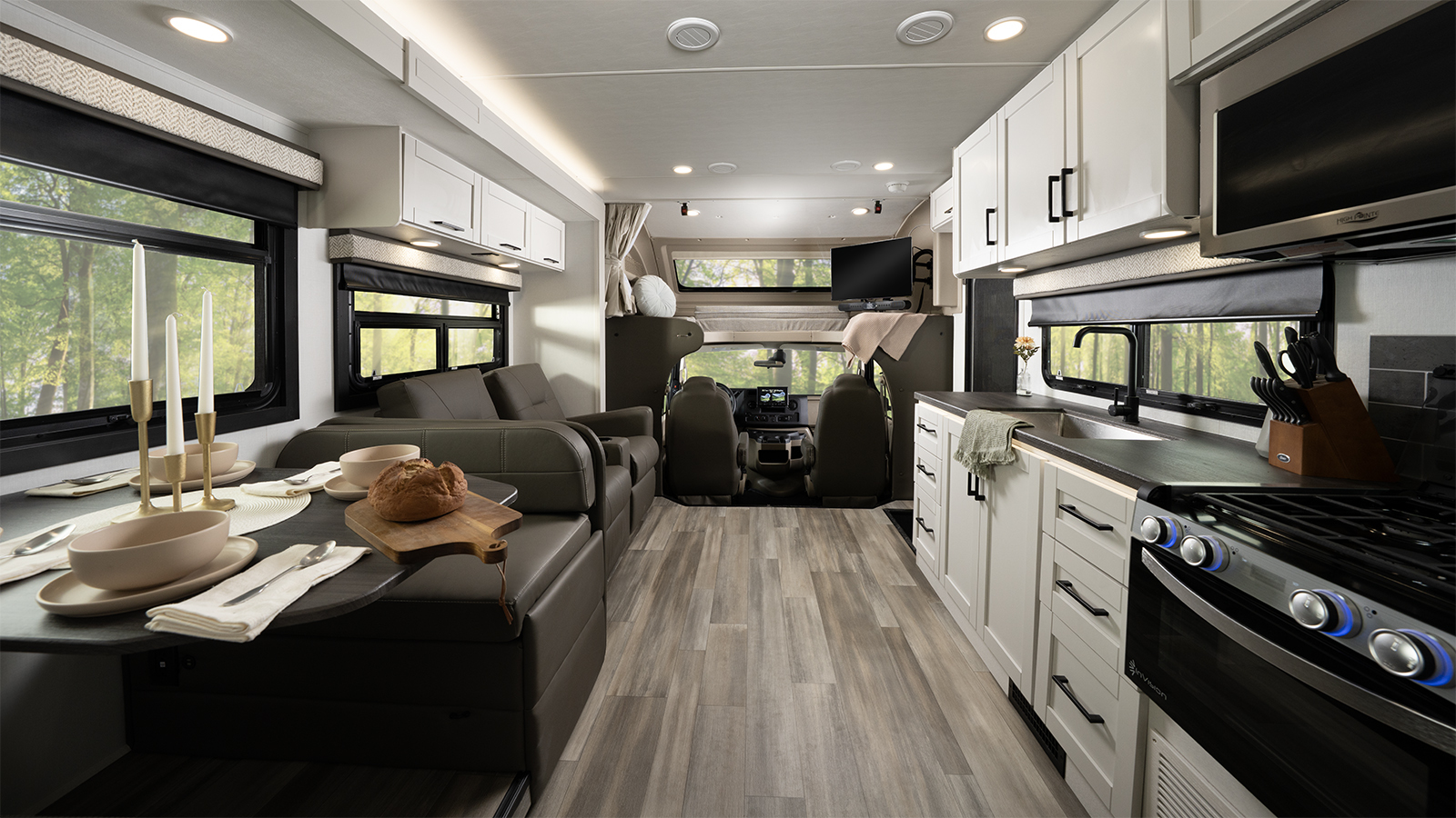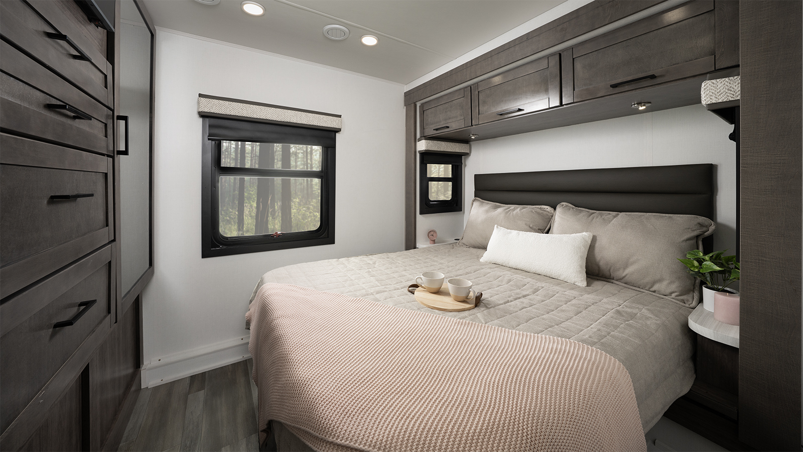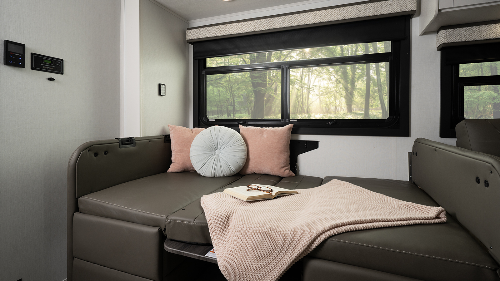 Inside the Greyhawk, comfort comes standard. Unwind on the walk-around queen-size (king-size on the 27U) bed while your devices stay charged using the built-in USB ports or wireless charging pads in the nightstands. The Jayco-exclusive legless dinette table easily converts from dining to sleeping position and is built to stay sturdy and supportive, even during mealtime or family game night. Every seating area includes safety belts, and the dinette is equipped with car seat tethers to keep little ones secure on the road. Outside, large rotocast storage compartments offer plenty of space and are easy to clean with a quick spray from the hose. Whether you're headed to the mountains, beach or somewhere in between, the Jayco Greyhawk blends luxury and practicality to help you make the most of every trip.