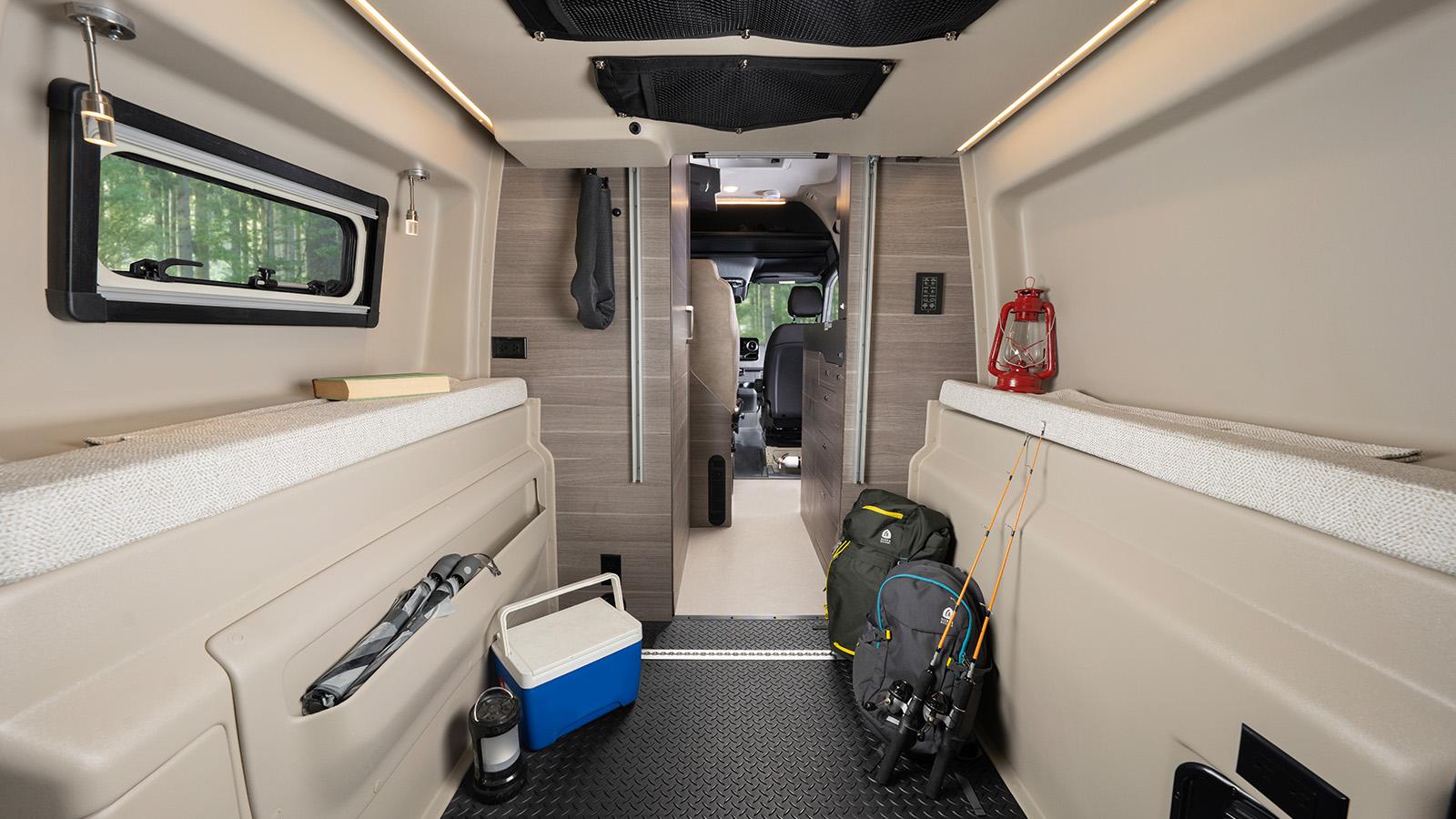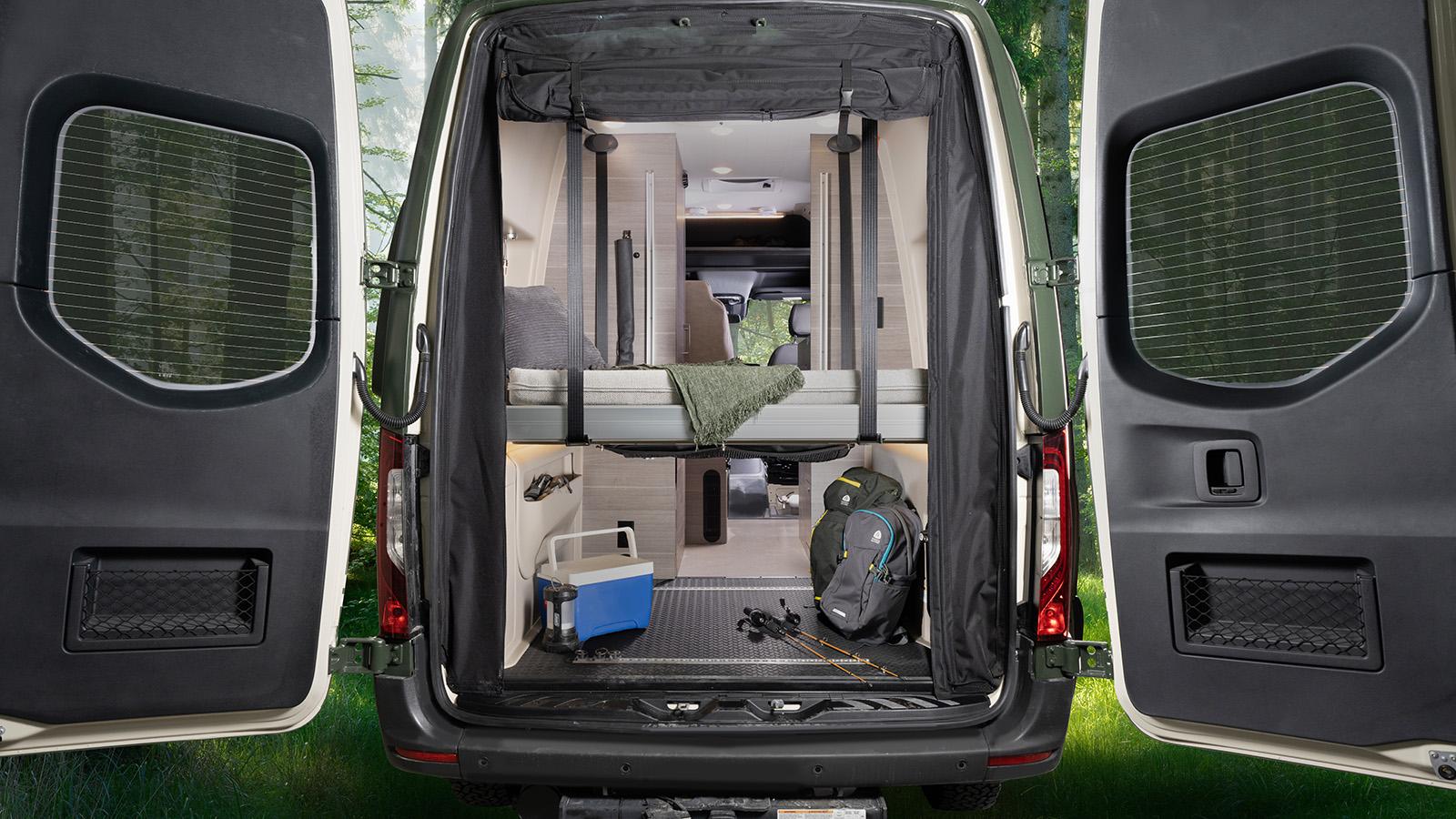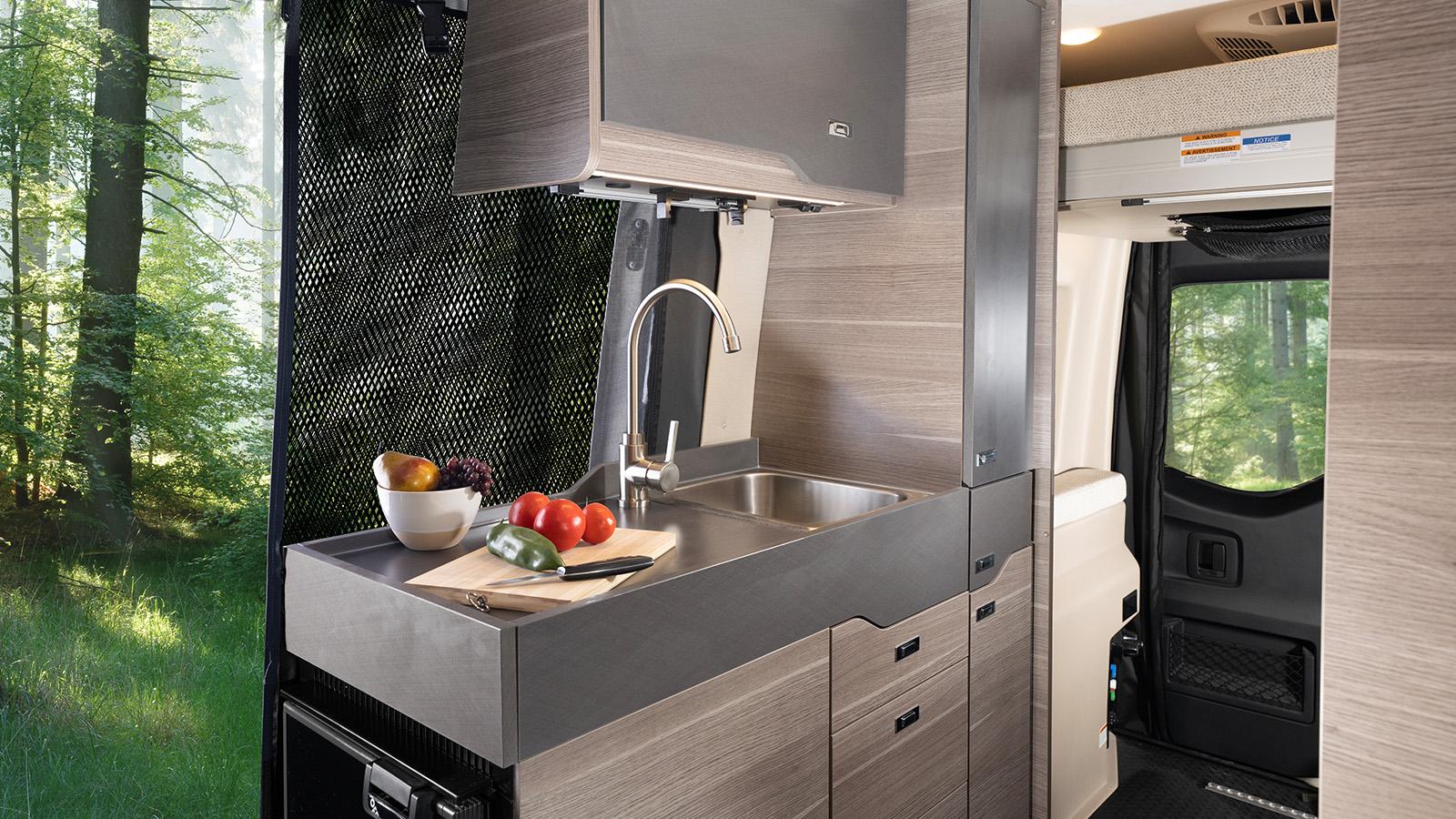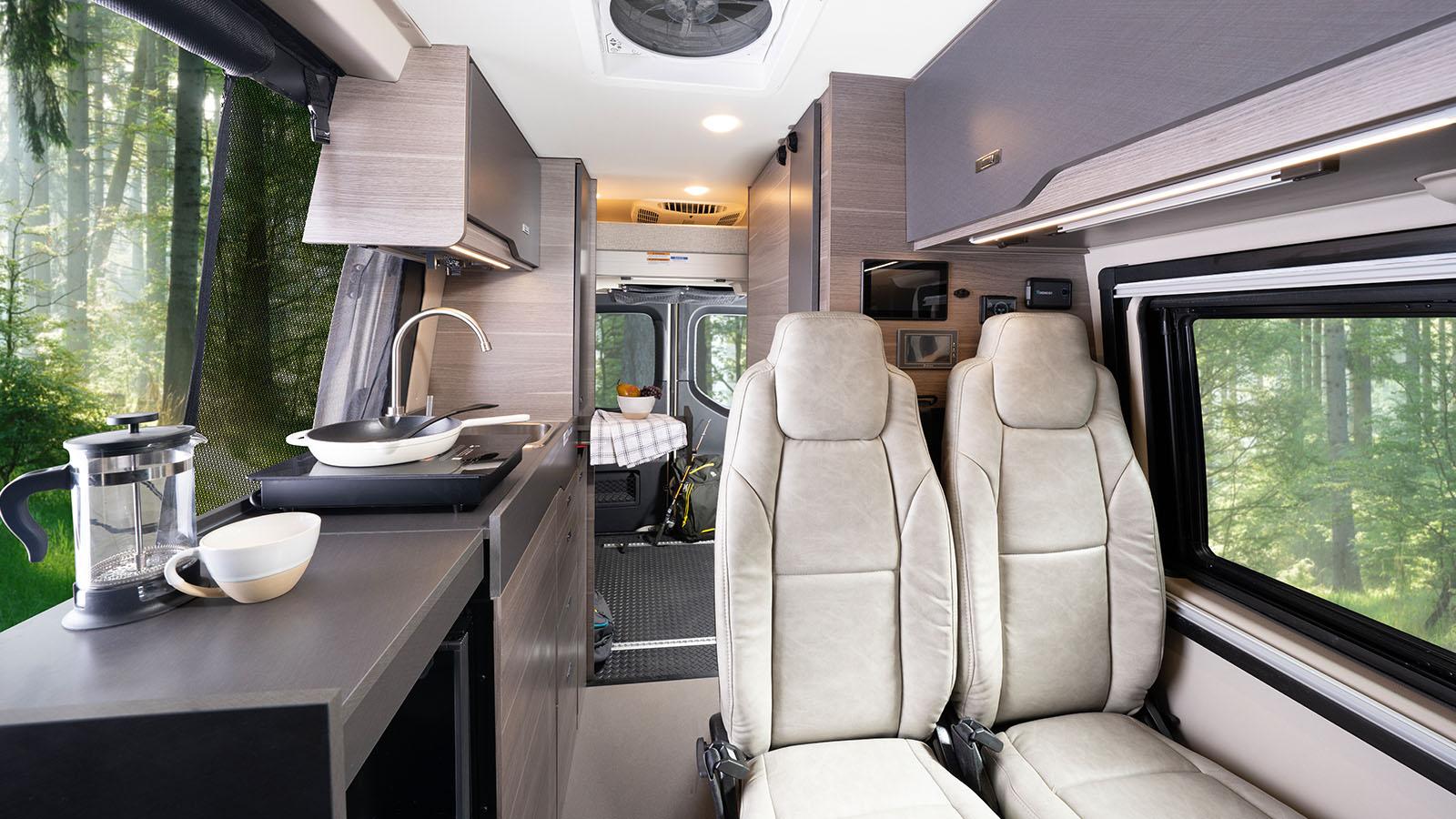 The Jayco Terrain Class B is ready to answer the call of the wild, starting with the Sprinter AWD Premium Mercedes-Benz® chassis it’s built on. The standard 48V 210 amp hour smart lithium battery provides 10KW hours of power and the new Starlink satellite internet system keeps you connected. Inside you’ll find Tecnoform® cabinets throughout with integrated kitchen pullouts, a dual bench seat with two seatbelts and slide/recline features and a rear garage with a power drop-down overhead bunk rated at 750 lbs.