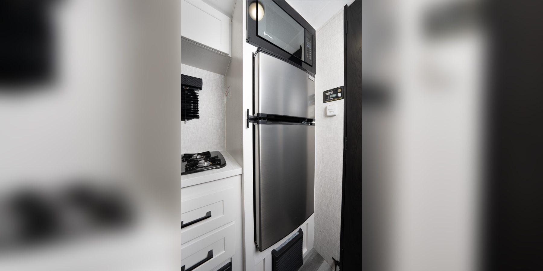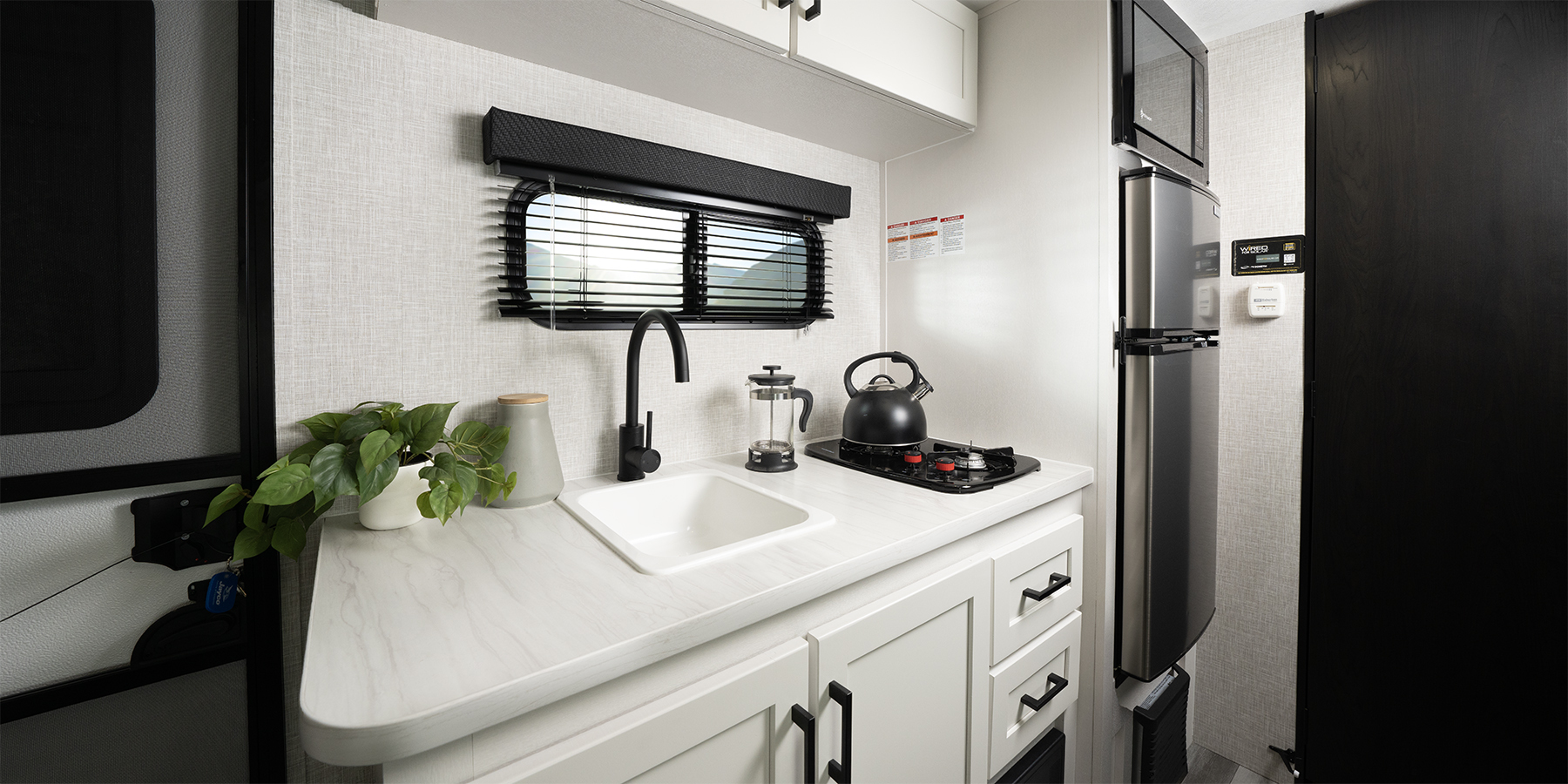 The included Customer Value Package takes your experience to the next level. Enjoy modern conveniences like a 5 cu. ft. 12V refrigerator, 13,500 BTU roof A/C, roof-mounted solar prep, and a microwave oven. Whether you’re staying cozy on a chilly night with the 19K BTU furnace or enjoying the shade of the power awning on a sunny day, the Jay Feather Air SL has you covered.