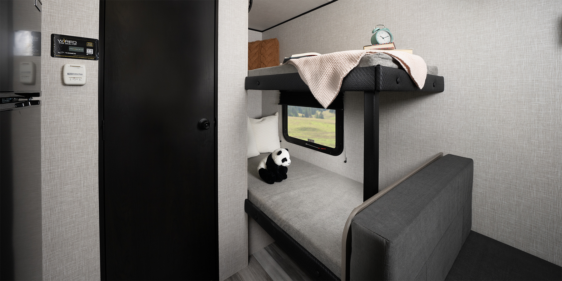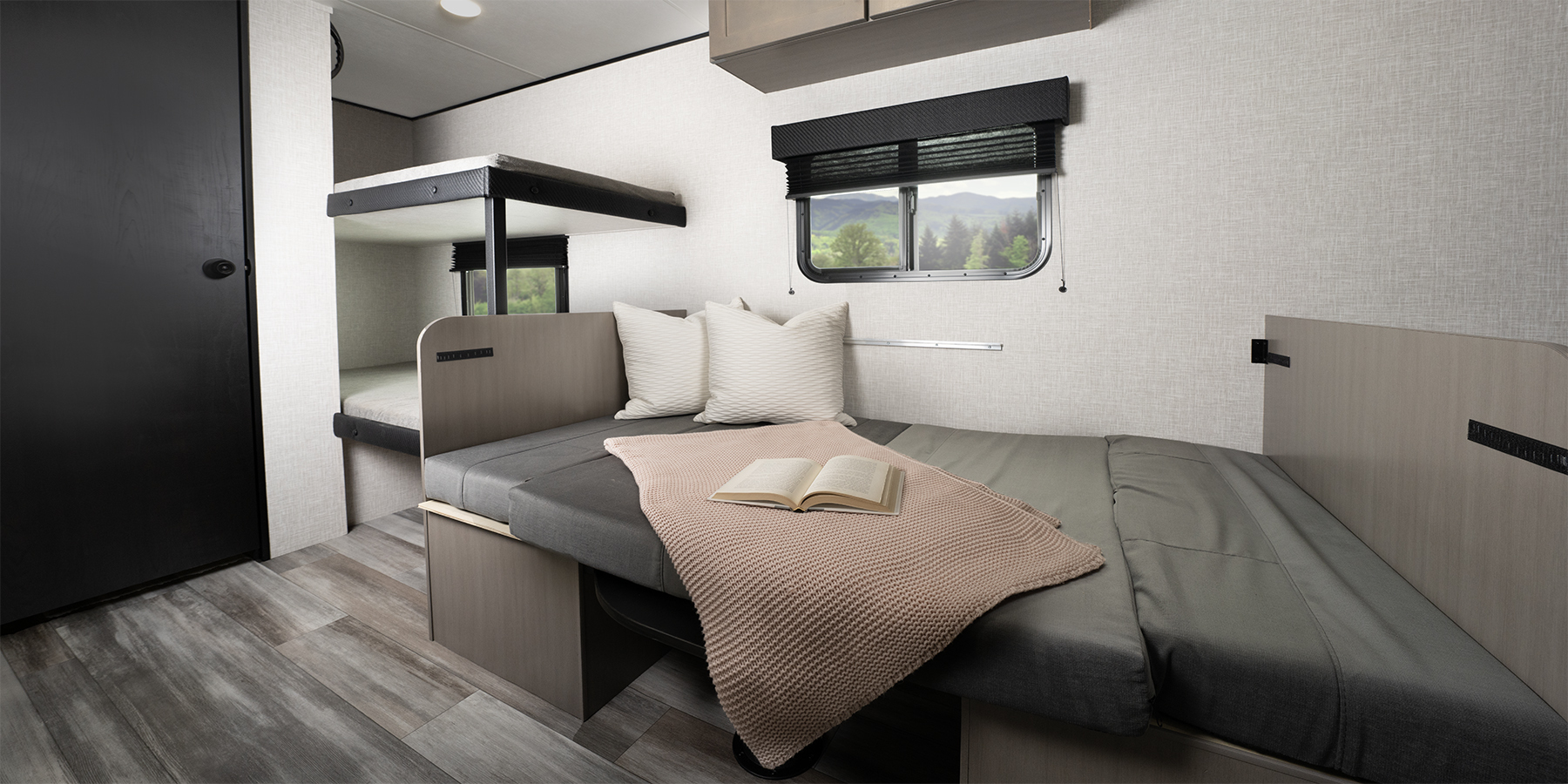 From the vinyl flooring throughout to the residential-style hidden cabinet door hinges, every detail has been designed to enhance your comfort. Enjoy your favorite meals at the sturdy plywood dinette, and rest easy on a queen mattress or in our ultra-durable bunk beds, rated to handle 300-600 lbs.