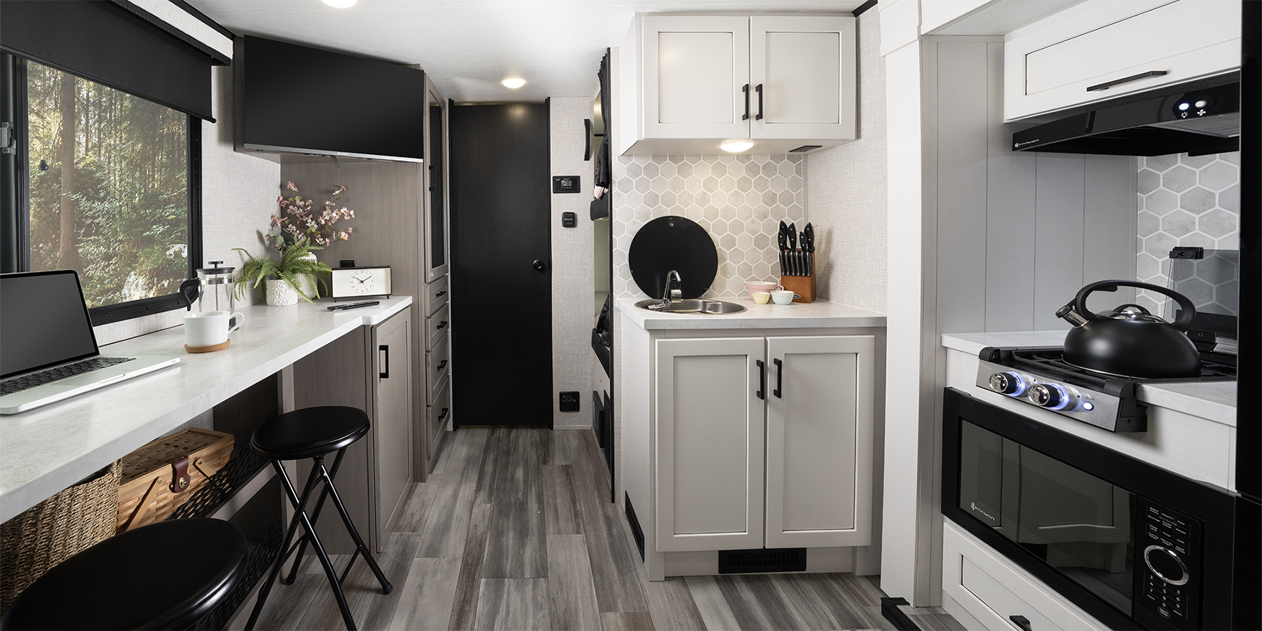 The cabinet doors and drawers are oversized, increasing storage space and maximizing the overall use of space. Hidden hinges and a seamless countertop in the kitchen add to the luxurious, residential feel. The InVision Suite appliance package comes standard and includes an 11-cubic-foot 12V fridge, which is five cubic feet larger than other brands. The kitchen in this lightweight travel trailer also features a stainless-steel sink with a fold-down faucet and glass top. In the bathroom, you’ll find high-rise gooseneck faucets and a new roller-style shower enclosure, that opens up the space even more.