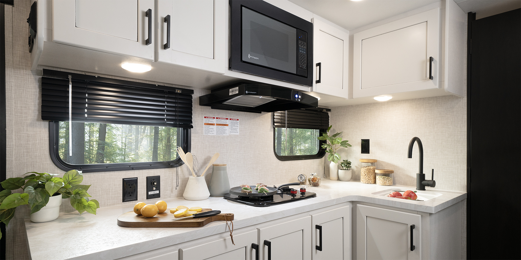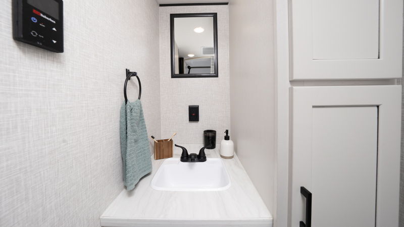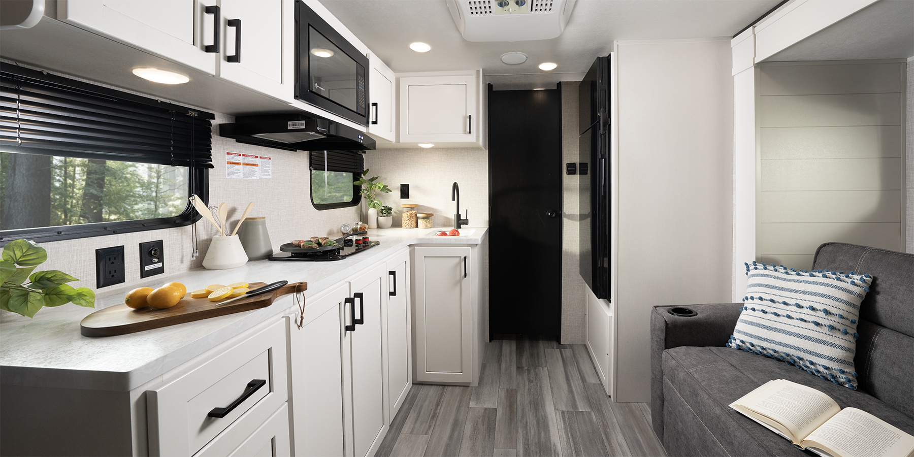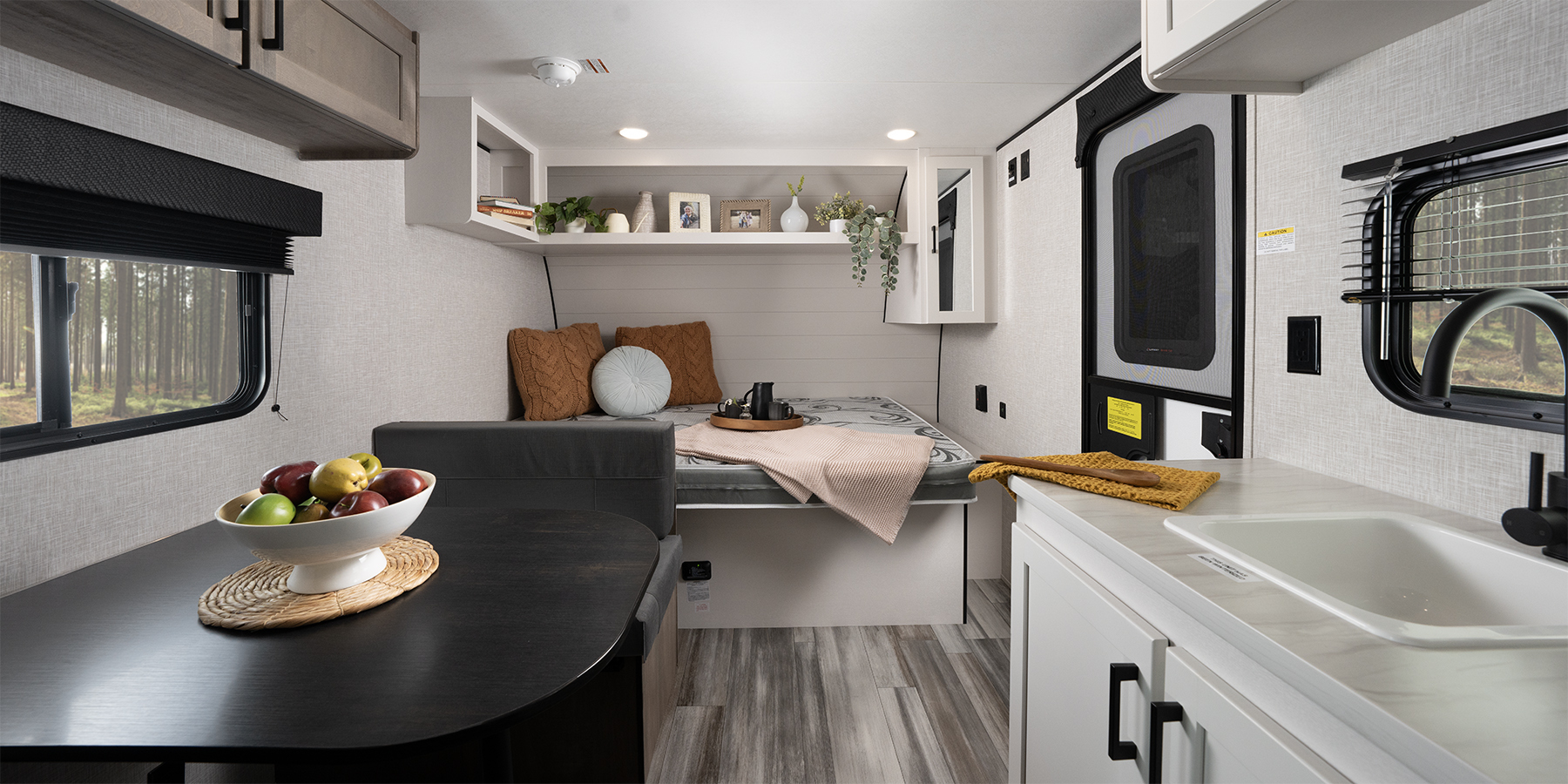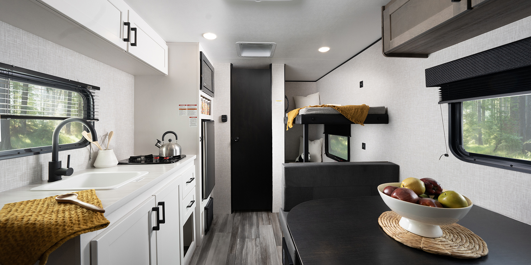 Inside, the Jay Flight SLX boasts some luxe residential features. Solid hardwood cabinet doors and drawers, with hidden cabinet hinges, offer a modern and sleek look. We continue to keep our owner's needs at the top of our mind, by offering oversized cabinets for increased storage space. In addition, you'll find maximized storage underneath the bed or bunk beds, under the dinettes, under the jack-knife sofas and even a neatly finished and lit exterior passthrough storage space. And just like our larger units, the Jay Flight SLX comes standard with a 60,000 BTU on-demand tankless water heater, for comfortable water temperatures as needed.