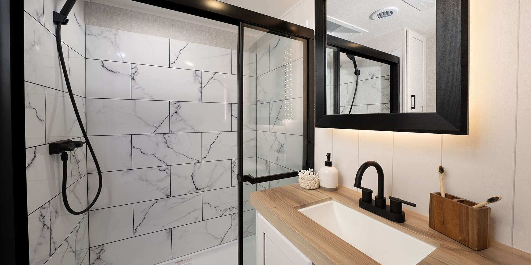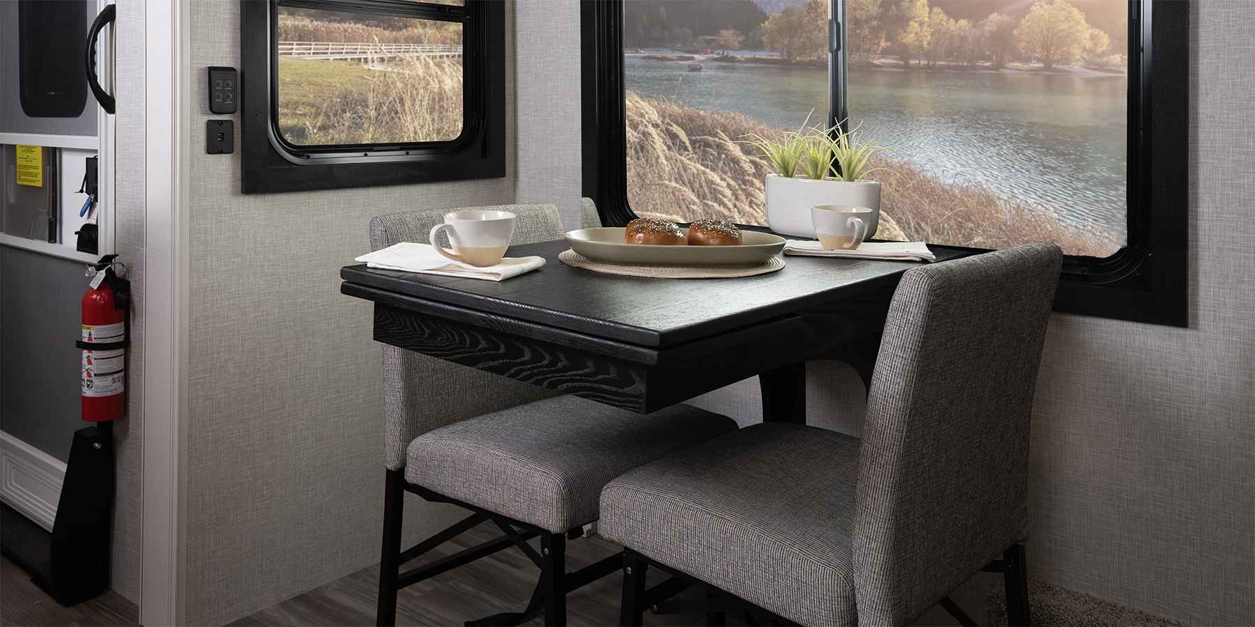 In the kitchen, you’ll find reliable GE brand appliances, including an edge-to-edge grate on the stove and an easy clean oven. The all-in-one sink can be used as a single basin or split up into multiple trays for multiple functions. If you feel like taking your cooking outdoors, the easy-to-start optional Halo Griddle offers a windproof design, wall-to-wall cooking, a dual-zone burner, a 300-500 degree range and an extra-large grease tray. If the weather turns, you can easily take the food indoors, where the dinette and office area can be quickly adjusted with the foldable chairs and pivoting table with an outlet below. Then, set the ambiance for dinner with the “Blue Sync” and MB Quart speakers for high-quality sound.