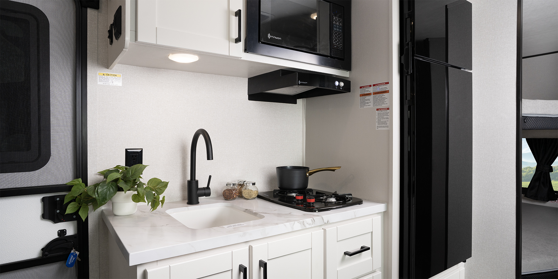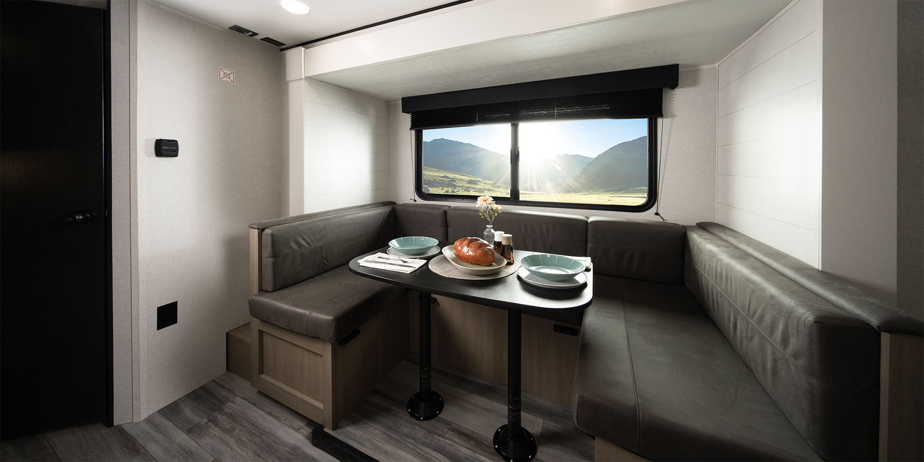 After a long day of exploring, step inside to enjoy instant hot water from the on-demand tankless water heater—up to 60,000 BTU in standard models and 42,000 BTU in the Sport Edition—so you can clean up comfortably, just like at home. Oversized G20 dark-tinted windows flood the space with natural light while blocking heat and UV rays, giving you both stunning views and added privacy.
