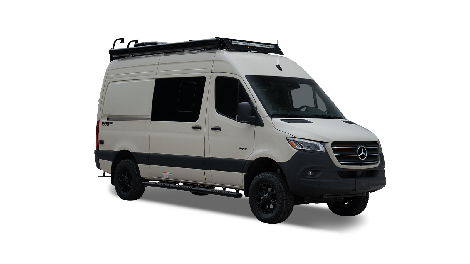 The Terrain rides on the Mercedes-Benz® Sprinter 2500 AWD chassis, equipped with a 144" wheelbase and a turbocharged 2.0L inline 4-cylinder Twin Turbo diesel engine that delivers 211 horsepower. Its powerful all-wheel drive system is backed by a suite of safety features to keep you in control wherever the trail leads. The JRide® ride and handling package adds Koni shocks and a heavy-duty rear stabilizer bar for a smooth and stable ride on rough terrain. When it’s time to gear up, a moveable roof ladder makes accessing your double roof rack simple, whether you're grabbing your kayak or storing camping essentials The integrated Lithionics® 48V 165 amp-hour smart lithium battery system supplies 7.9KW hours of clean, quiet power so you can stay off-grid longer. For those who prefer the affordability of a generator, a 2,500W LP generator can be optioned in place of the lithium package.
