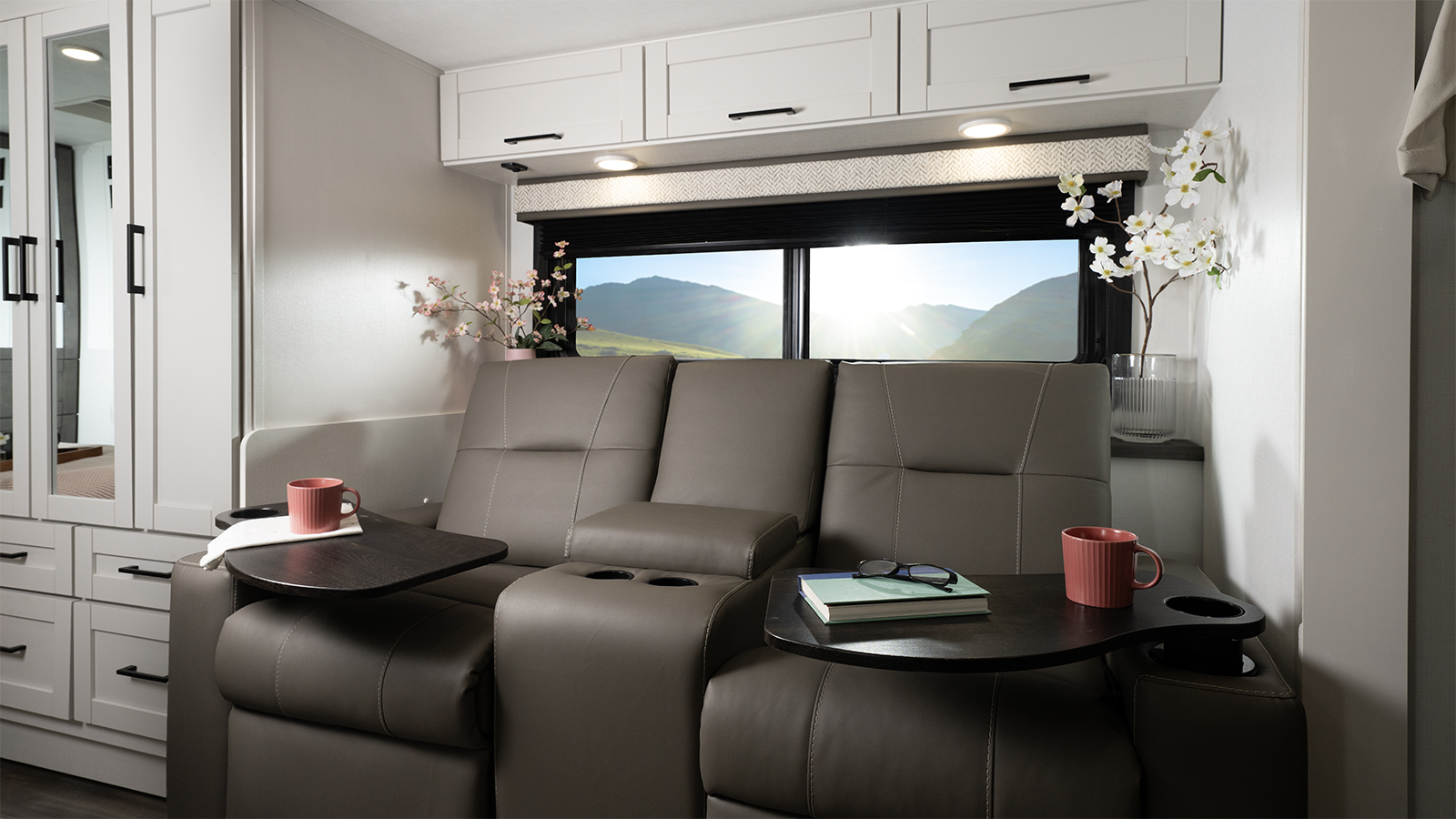 Inside, the Redhawk offers touches that feel right at home, starting with hardwood cabinet doors and drawers, reduced visible stiles for a clean finish and a full-size residential microwave. The dining area features Jayco’s exclusive legless dinette table, which is sturdy, easy to operate, and quickly converts from mealtime to bedtime mode. There are seatbelts in every seating location, and child safety tethers in the dinette, ensuring your family's safety during travel. Up front, the 9-inch Sony® infotainment system includes Apple® CarPlay™, Android Auto™ and a tilt feature, offering a bright, easy-to-read display that helps you stay connected and focused on the road. From its smart safety features to elevated design inside and out, the Redhawk Class C delivers a first-class RV experience that’s ready for the road ahead.