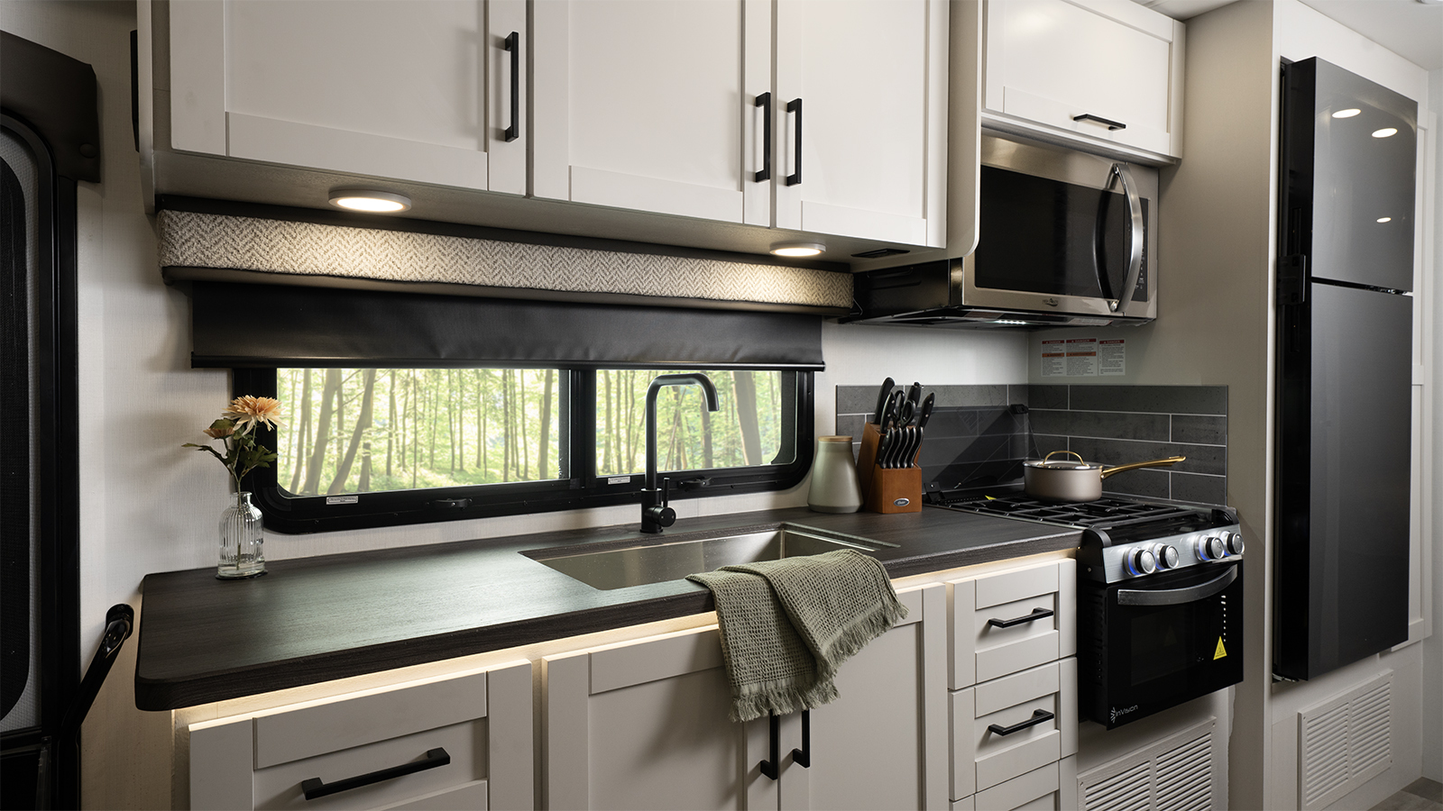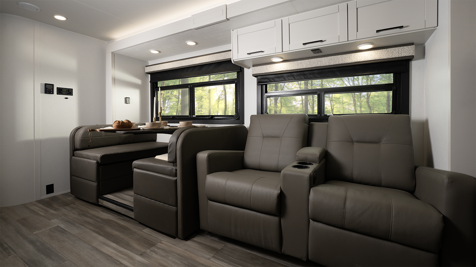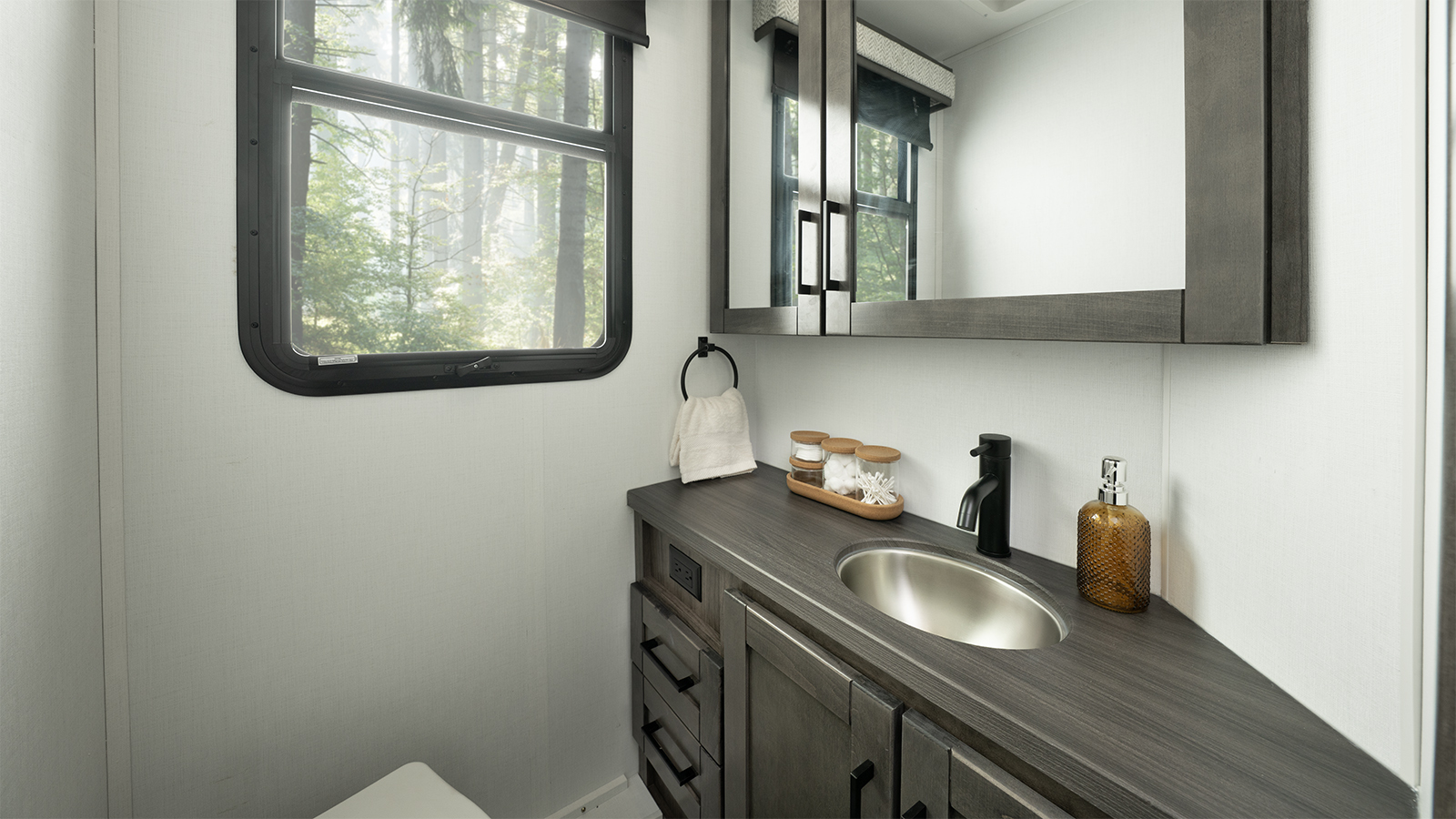 Inside the Greyhawk, comfort comes standard. Unwind on the walk-around queen-size (king-size on the 27U) bed while your devices stay charged using the built-in USB ports or wireless charging pads in the nightstands. The Jayco-exclusive legless dinette table easily converts from dining to sleeping position and is built to stay sturdy and supportive, even during mealtime or family game night. Every seating area includes safety belts, and the dinette is equipped with car seat tethers to keep little ones secure on the road. Outside, large rotocast storage compartments offer plenty of space and are easy to clean with a quick spray from the hose. Whether you're headed to the mountains, beach or somewhere in between, the Jayco Greyhawk blends luxury and practicality to help you make the most of every trip.