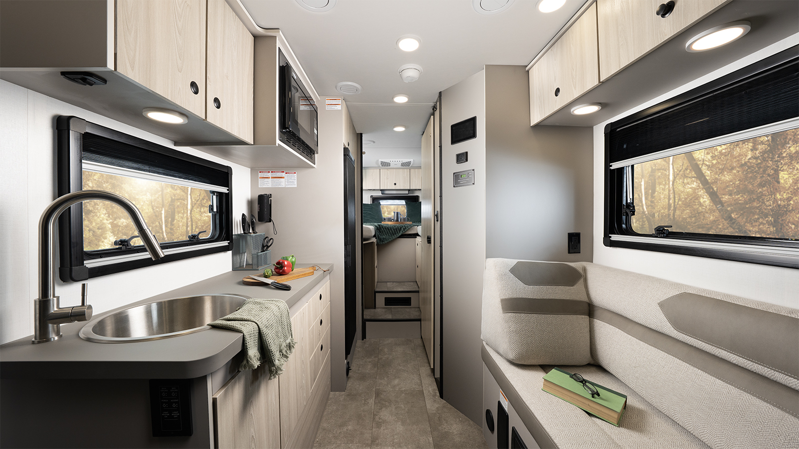 No matter which chassis you choose, Granite Ridge is built to go further. Two-inch walls, enclosed holding tanks, and dual-pane acrylic windows help extend your travels into colder seasons. Both floorplans include a lounge area behind the captain's chairs, twin beds in the rear that convert to a large bed by adding a filler cushion, a wet bath and a kitchen featuring a refrigerator, stainless steel sink and portable induction cooktop. In the 22T, the lounge